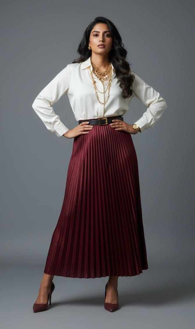 This maroon satin pleated skirt offers a refined elegance with its smooth, lustrous fabric and carefully crafted pleats. Its premium quality ensures a flattering drape and versatile style options, making it suitable for both formal occasions and chic casual looks. The rich maroon hue adds depth and sophistication, allowing effortless pairing with a range of tops and accessories. Ideal for those seeking a timeless yet distinctive addition to their wardrobe.
