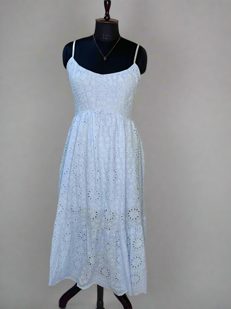 This baby blue tiered dress, crafted from breathable eyelet fabric, offers comfort and style for beach vacations or casual outings. Its adjustable straps ensure a perfect fit, while the tiered design adds a subtle flow and elegance, making it an effortlessly chic choice for warm days.
